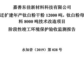 公?? 示??? 根據(jù)《國務院關(guān)于修改〈建設(shè)項目竣工環(huán)境保護管理條例〉的決定》(國務院令第682號),以及環(huán)保部《關(guān)于發(fā)布的公告》(國環(huán)規(guī)環(huán)評[2017]4號),現(xiàn)將嘉善東佳新材料科技有限公司遷擴建年產(chǎn)鈦白粉干粉12000噸,鈦白粉母料8000噸技術(shù)改造項目階段性竣工環(huán)境保護